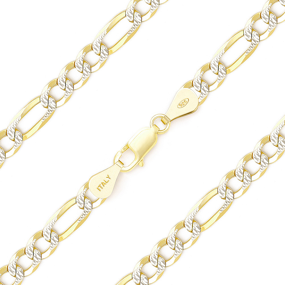 Loading... Please wait...The featured Italian-made 5mm chain bracelet is cast in 14k yellow gold plated .925 sterling silver figaro links detailed on both sides with diamond-cut pave facets plated with rhodium then finished with a lobster-claw clasp for secure wear.
