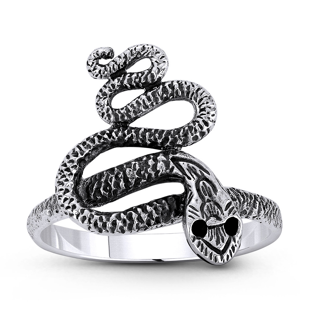 Loading... Please wait...The featured ring is cast in oxidized .925 sterling silver and showcases an intricately crafted snake that coils itself into a thin band for an easy fit around your finger.