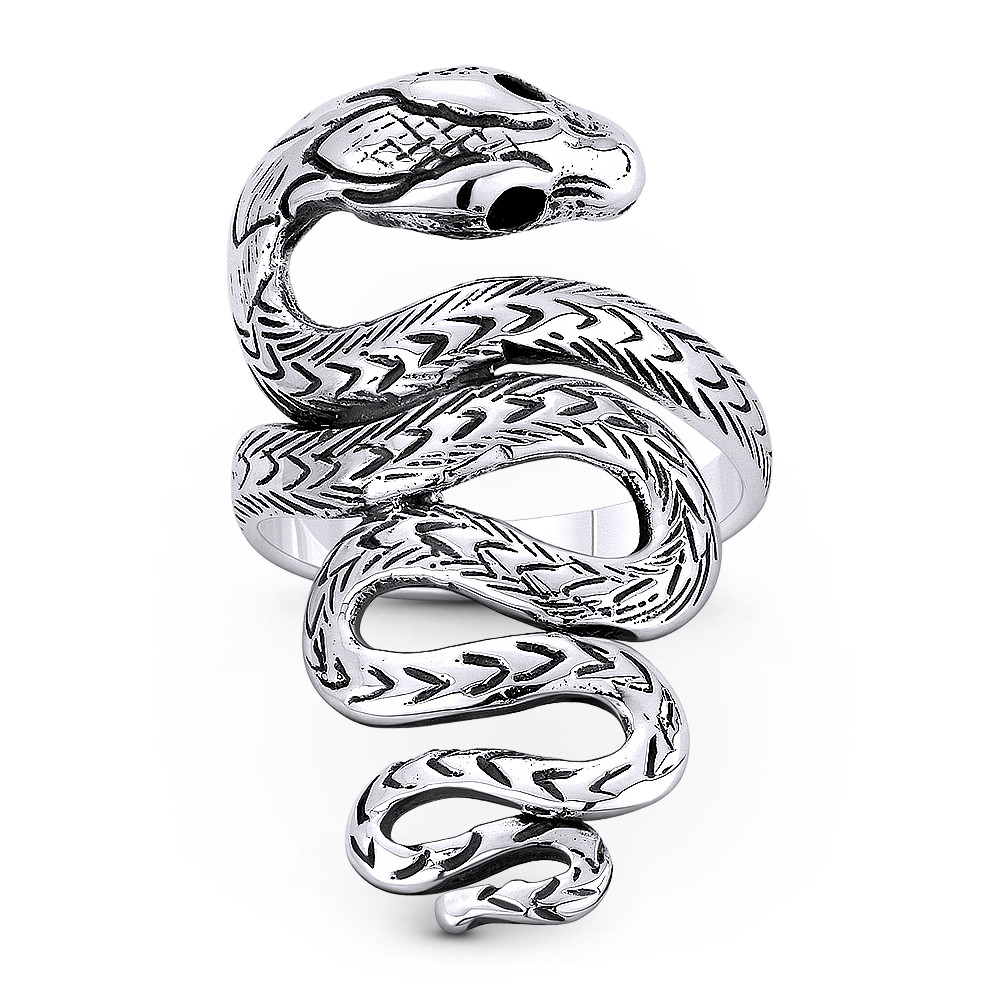 Loading... Please wait...The featured ring is cast in oxidized .925 sterling silver and showcases an intricately crafted snake that coils itself into a thin band for an easy fit around your finger.