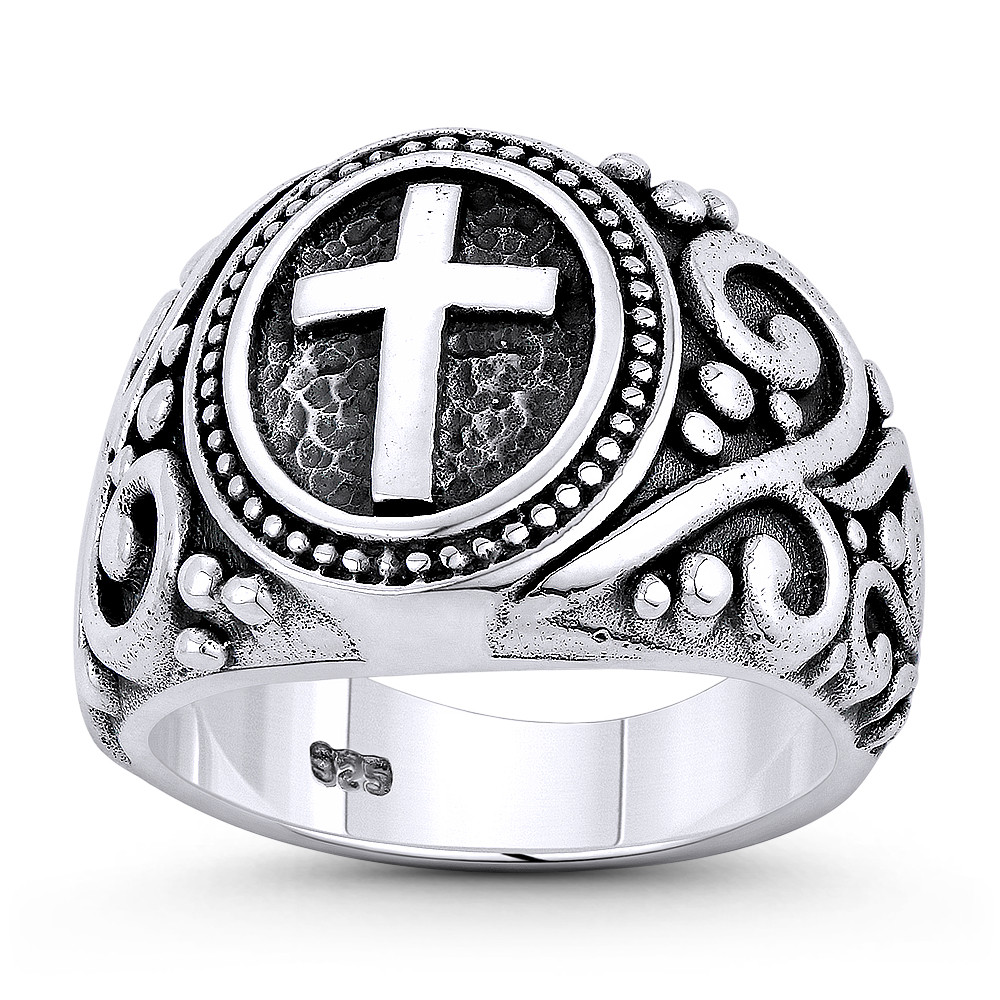 Loading... Please wait...The featured ring is cast in oxidized .925 sterling silver and showcases a signet style ring with a latin cross centerpiece adorned with intricately swirling filigree details on both sides.