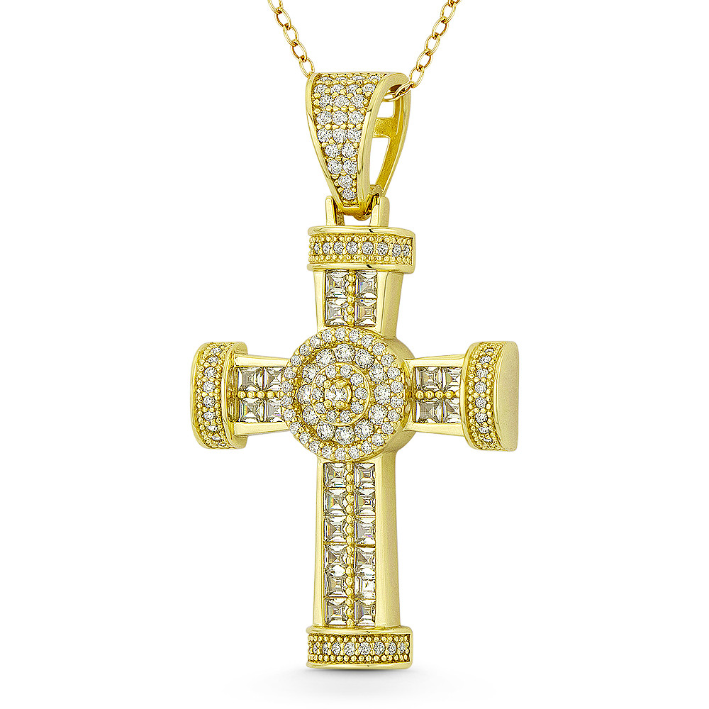 Loading... Please wait...The featured pendant is cast in 14k yellow gold-plated .925 sterling silver and showcases a large cross adorned with asscher & round cut cubic zirconia crystals then finished with a large & sturdy bail that will accommodate most chain sizes.