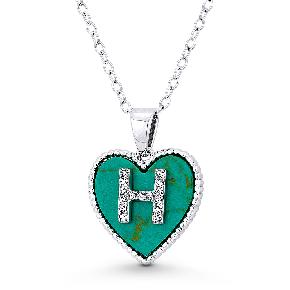 Loading... Please wait...The featured pendant is cast in .925 sterling silver and showcases a 15x15mm (0.6x0.6in) heart adorned with a synthetic turquoise heart topped by an initial "H" crafting w/ cubic zirconia crystals. The heart is then finished with a sturdy loop to accommodate most standard chains and plated with rhodium for tarnish protection.