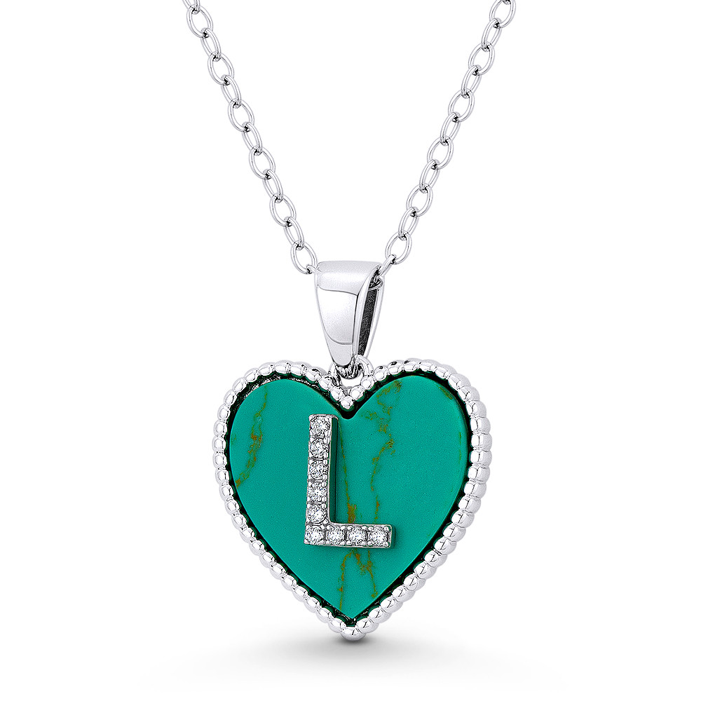 Loading... Please wait...The featured pendant is cast in .925 sterling silver and showcases a 15x15mm (0.6x0.6in) heart adorned with a synthetic turquoise heart topped by an initial "L" crafting w/ cubic zirconia crystals. The heart is then finished with a sturdy loop to accommodate most standard chains and plated with rhodium for tarnish protection.