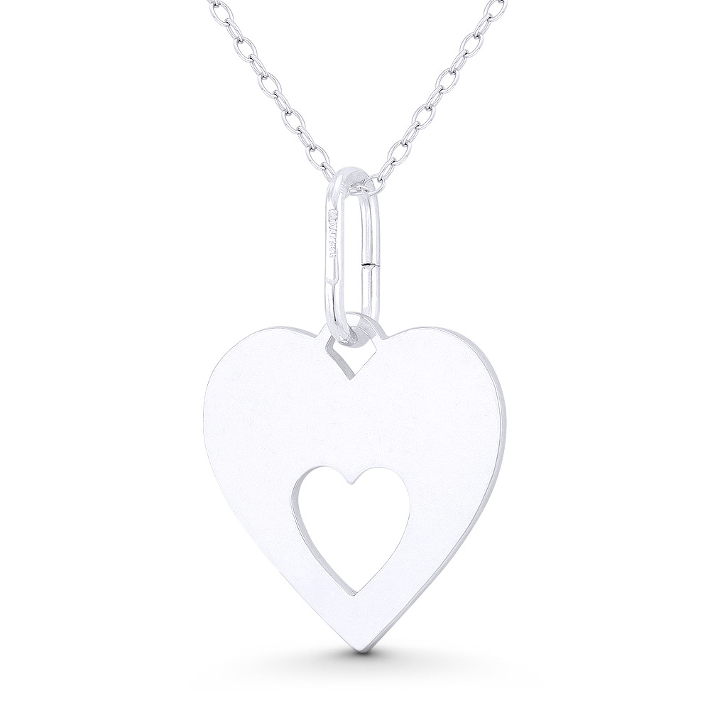 Loading... Please wait...The featured Italian-made pendant is cast in .925 sterling silver and showcases a flat heart design with a small heart cutout then finished w/ a sturdy bail that will accommodate most average-sized chains.