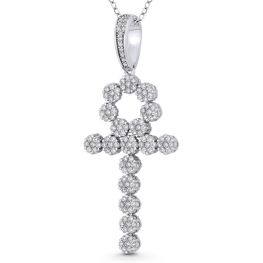 Loading... Please wait...The featured pendant is cast in rhodium-plated .925 sterling silver and showcases an ankh cross made up of multiple clusters of cubic zirconia crystals then finished with a large & sturdy bail that will accommodate most chain sizes.