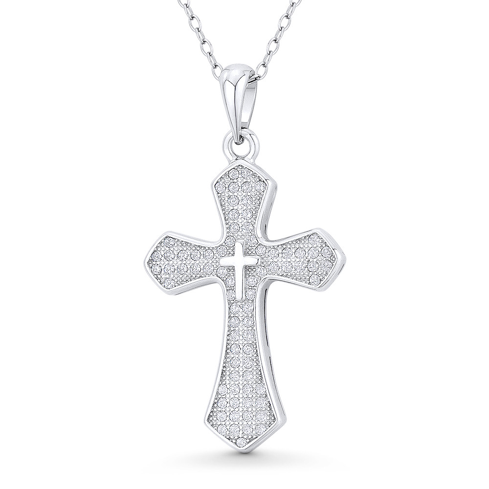 Loading... Please wait...The featured pendant is cast in rhodium-plated .925 sterling silver and showcases a flared passion cross paved with cubic zirconia crystals and a small latin cross at the center. It is then finished with a sturdy bail that will accommodate most average-sized chains.