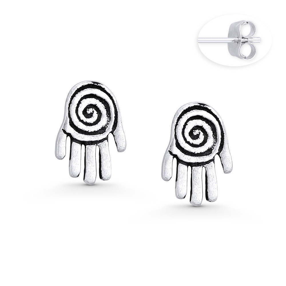 The featured earrings are cast in .925 sterling silver and showcases oxidized-finish hamsa hand charms with swirling patterns on the palms finished with push-back posts & butterfly clasps for secure wear.
