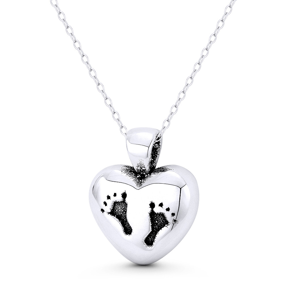 Loading... Please wait...The featured lightweight & hollow pendant is cast in oxidized .925 sterling silver and showcases a heart with baby footprint charm finished w/ a sturdy bail that will accommodate most average-sized chains.