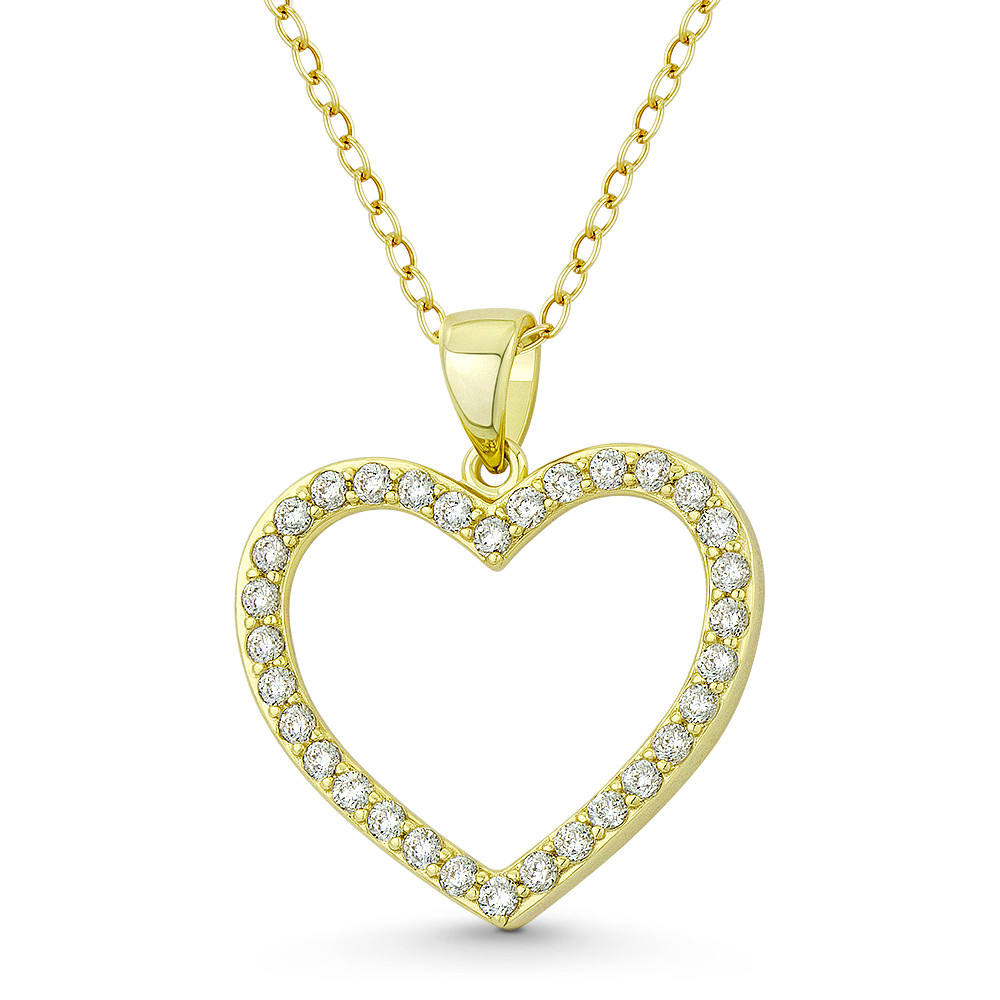 Loading... Please wait...The featured pendant is cast in .925 sterling silver and showcases an open-outline heart charm adorned with cubic zirconia crystals. The pendant is then finished with a sturdy loop to accommodate most standard chains and plated with 14k yellow gold.
