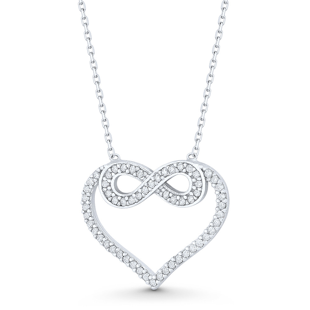 The featured necklace is cast in .925 sterling silver and showcases an open-design heart & infinity charm adorned w/ cubic zirconia crystals. The charm is then attached to anchor link chains finished with a spring-ring clasp and an extender chain for secure wear.