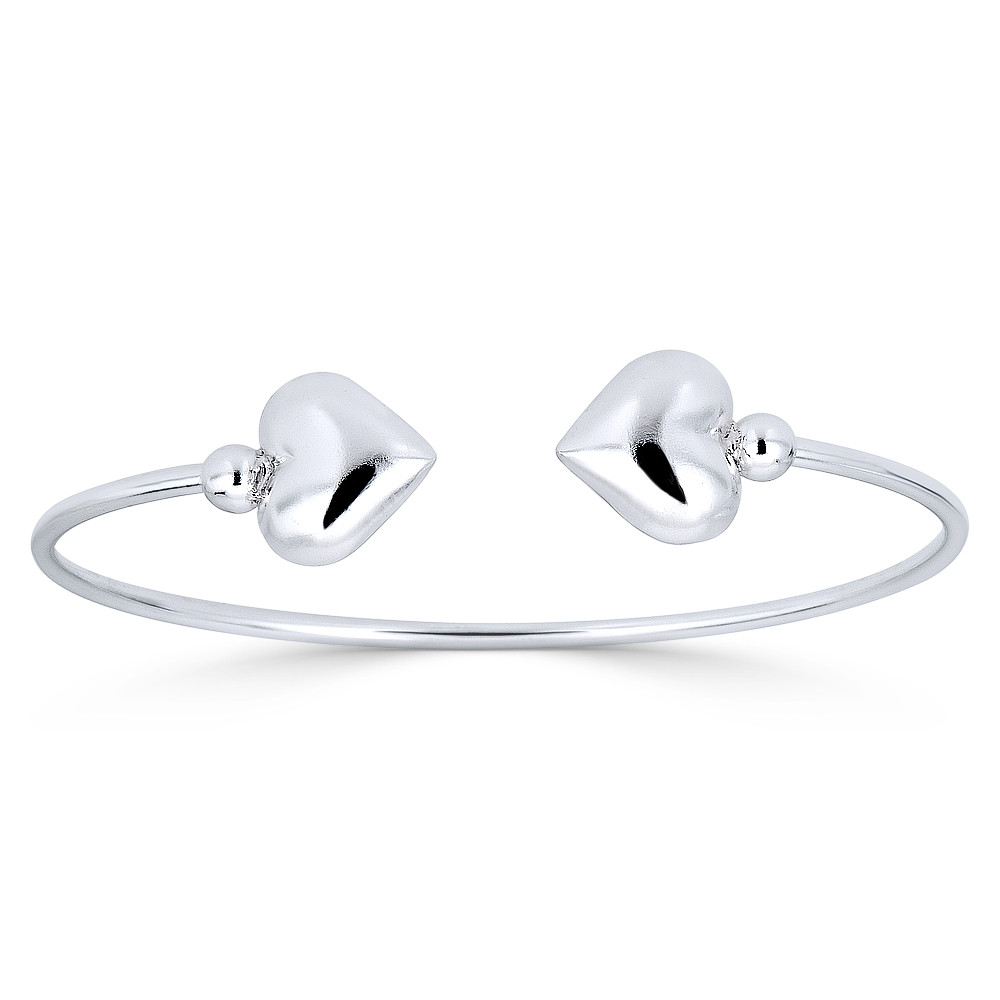 The featured bangle is cast in .925 sterling silver and showcases two hollow-cast hearts & ball beads on both ends of the open-cuff design.