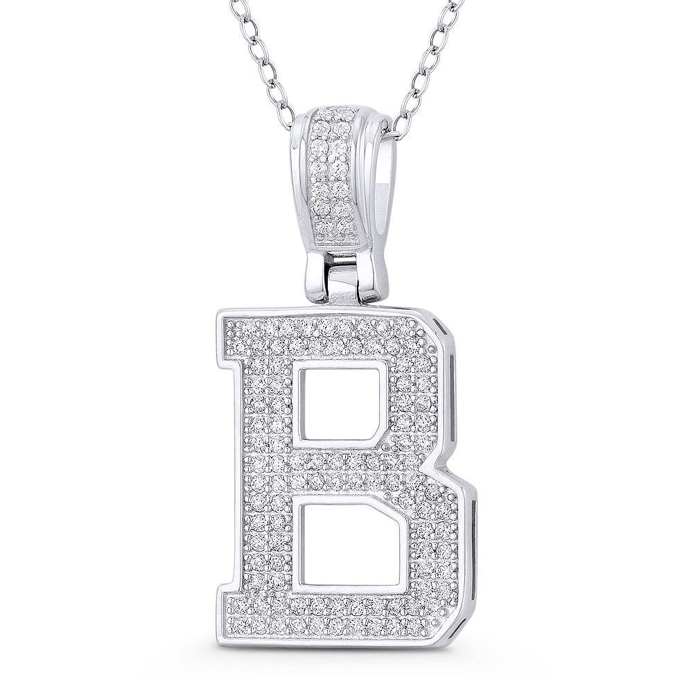 Loading... Please wait...The featured pendant is cast in .925 sterling silver and showcases a block script initial "B" design paved w/ cubic zirconia crystals. The pendant is then finished with a sturdy bail that will accommodate most standard chains and plated with rhodium.