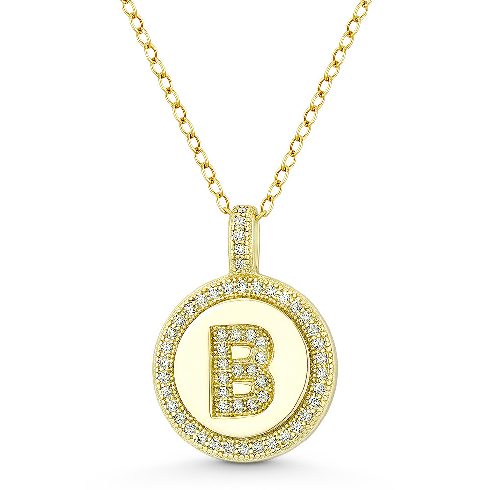 Loading... Please wait...The featured pendant is cast in .925 sterling silver w/ 14k yellow gold plating and showcases a round disc adorned with cubic zirconia crystals paved along the bail, around the disc, and the letter "B" centerpiece design.