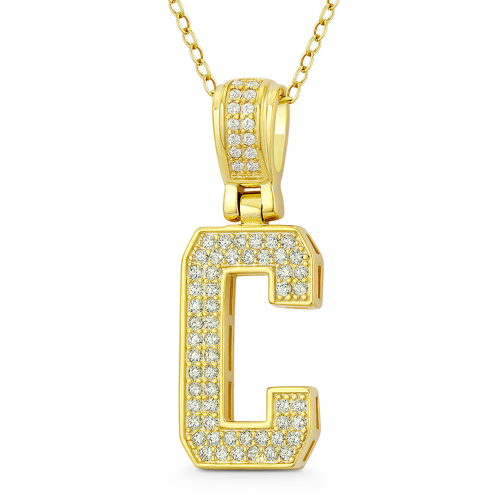 Loading... Please wait...The featured pendant is cast in .925 sterling silver and showcases a block script initial "C" design paved w/ cubic zirconia crystals. The pendant is then finished with a sturdy bail that will accommodate most standard chains and plated with 14k yellow gold.