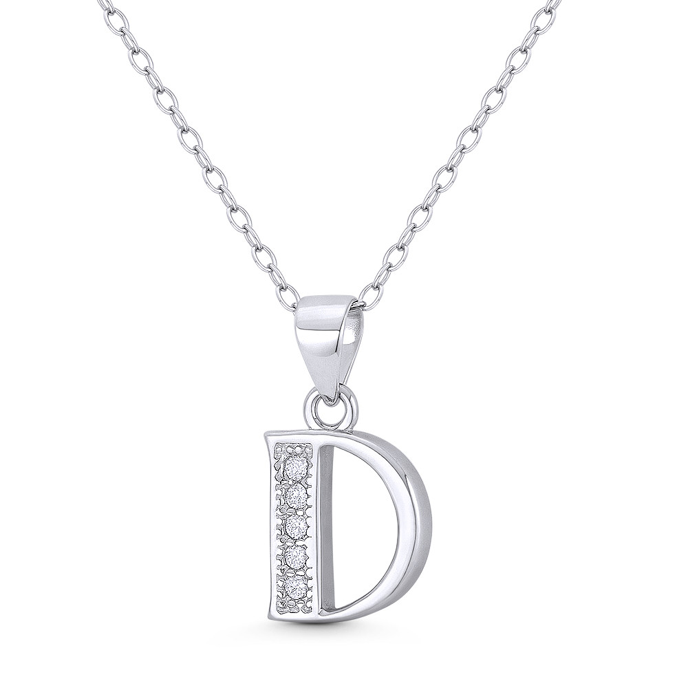 Loading... Please wait...The featured pendant is cast in .925 sterling silver and showcases a block script initial "D" design paved w/ cubic zirconia crystals. The pendant is then finished with a sturdy bail that will accommodate most standard chains and plated with rhodium.