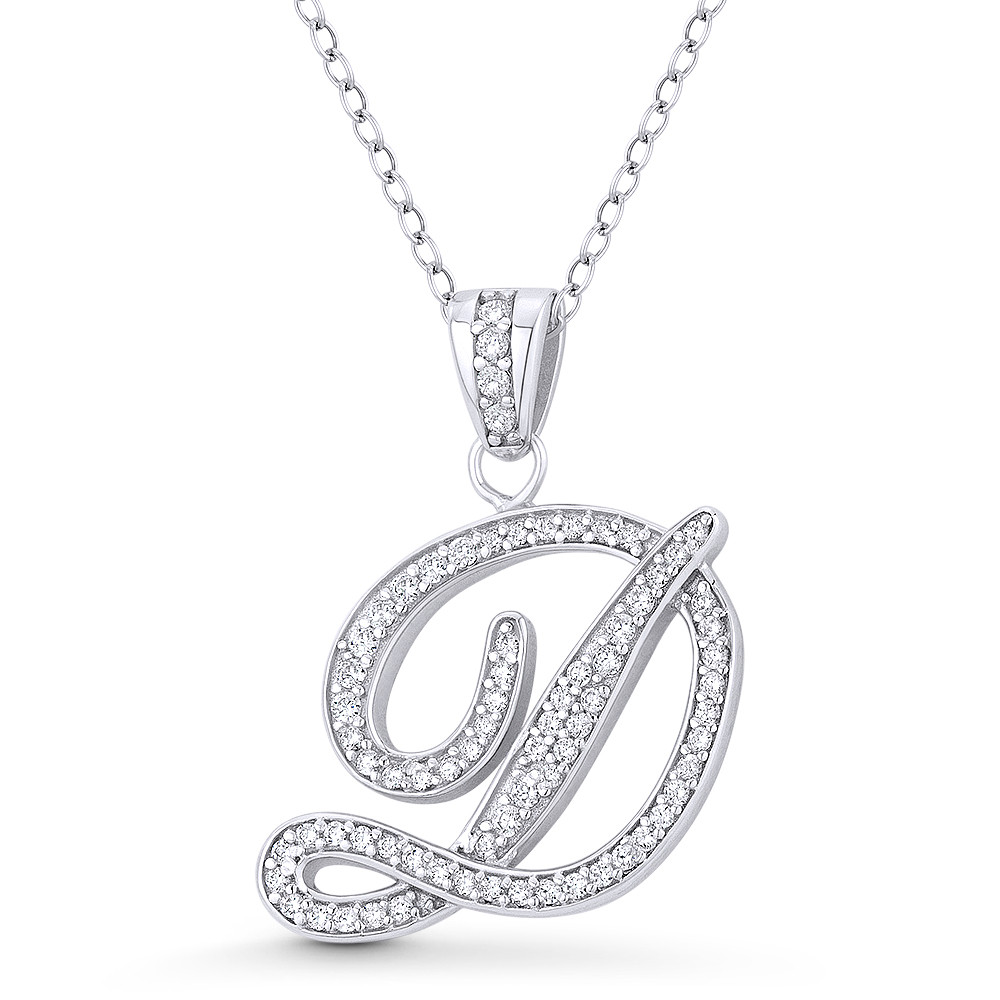 Loading... Please wait...The featured pendant is cast in .925 sterling silver and showcases a cursive script initial "D" design paved w/ cubic zirconia crystals. The pendant is then finished with a sturdy bail that will accommodate most standard chains and plated with rhodium.