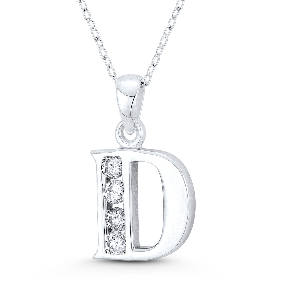 Loading... Please wait...The featured pendant is cast in .925 sterling silver and showcases an initial "D" design adorned with round brilliant cut cubic zirconia crystals. The pendant is then finished with a sturdy bail that can accommodate most chain sizes.