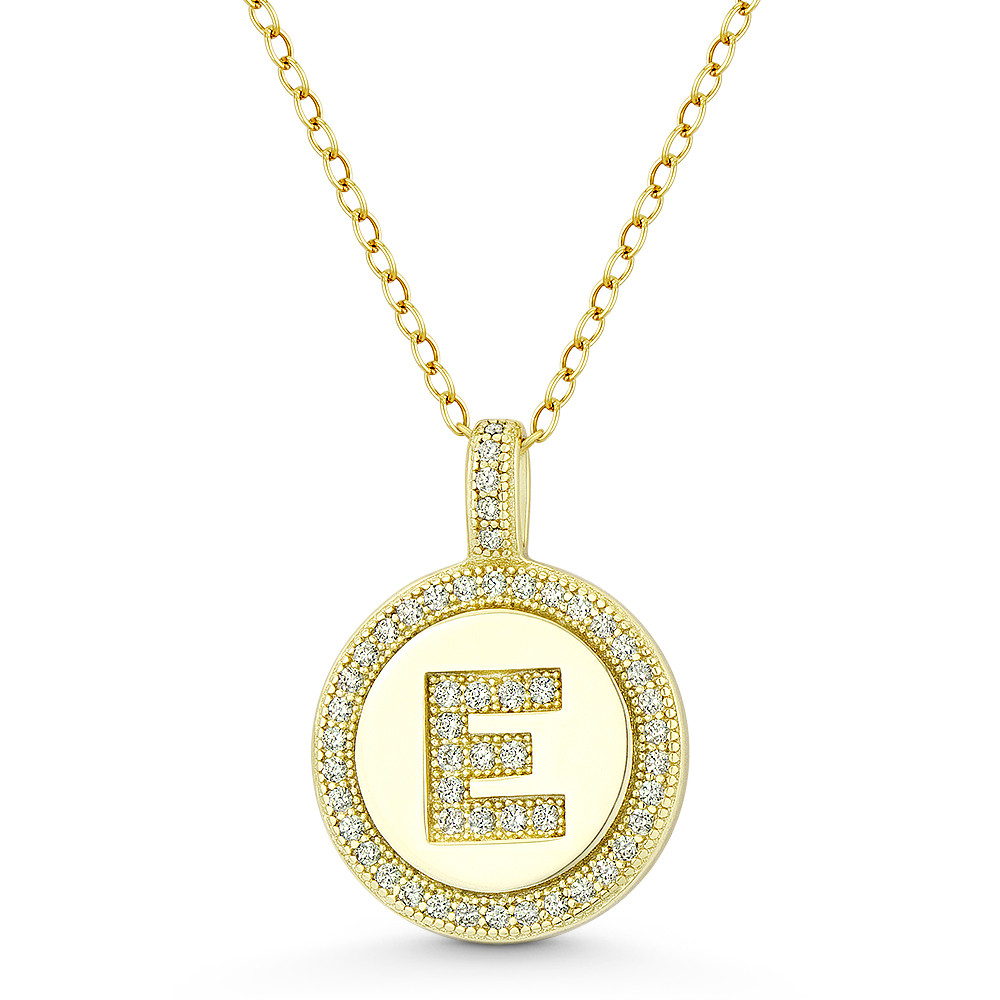 Loading... Please wait...The featured pendant is cast in .925 sterling silver w/ 14k yellow gold plating and showcases a round disc adorned with cubic zirconia crystals paved along the bail, around the disc, and the letter "E" centerpiece design.