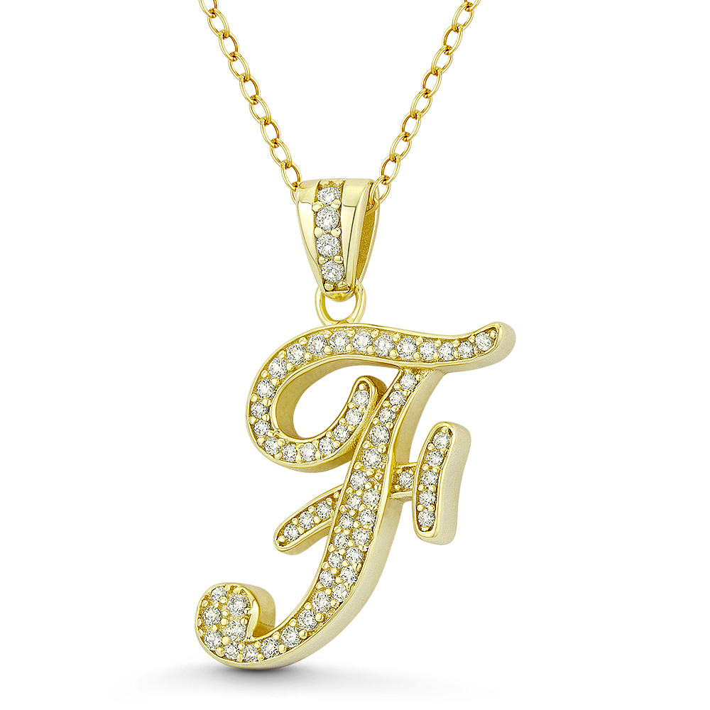 Loading... Please wait...The featured pendant is cast in .925 sterling silver and showcases a cursive script initial "F" design paved w/ cubic zirconia crystals. The pendant is then finished with a sturdy bail that will accommodate most standard chains and plated with 14k yellow gold.