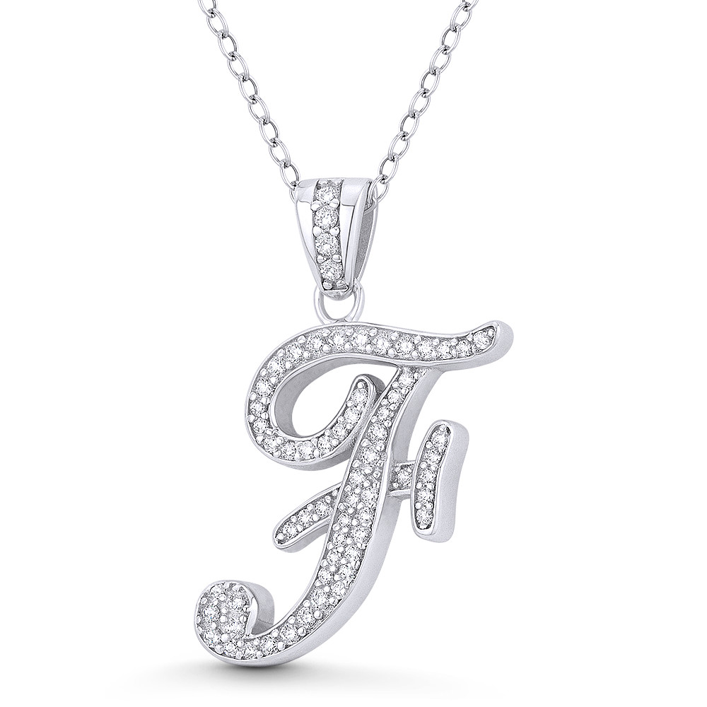 Loading... Please wait...The featured pendant is cast in .925 sterling silver and showcases a cursive script initial "F" design paved w/ cubic zirconia crystals. The pendant is then finished with a sturdy bail that will accommodate most standard chains and plated with rhodium.