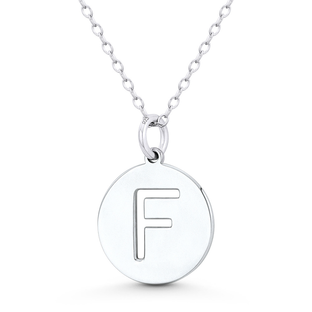 Loading... Please wait...The featured pendant is cast in .925 sterling silver and showcases a 15mm (0.6in) round flat disc detailed with an initial "F" cutout. The disc is then finished with a small ring bail that can accommodate thin chains so it can be worn as a pendant or as an additional charm for your bracelets, necklaces, or other accessories.