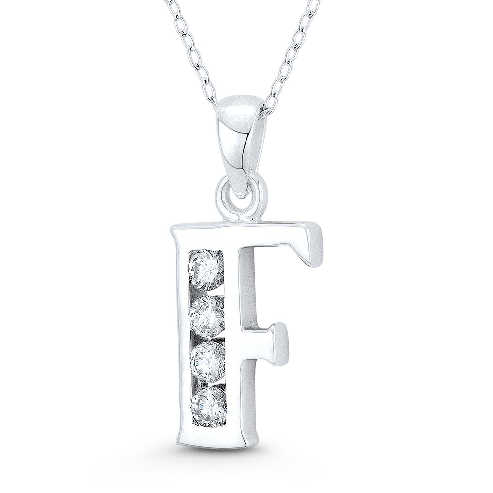 Loading... Please wait...The featured pendant is cast in .925 sterling silver and showcases an initial "F" design adorned with round brilliant cut cubic zirconia crystals. The pendant is then finished with a sturdy bail that can accommodate most chain sizes.