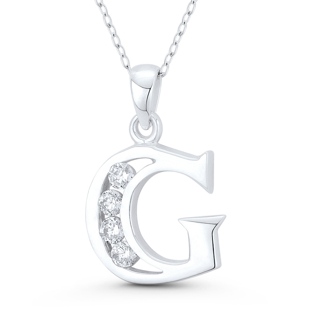 Loading... Please wait...The featured pendant is cast in .925 sterling silver and showcases an initial "G" design adorned with round brilliant cut cubic zirconia crystals. The pendant is then finished with a sturdy bail that can accommodate most chain sizes.