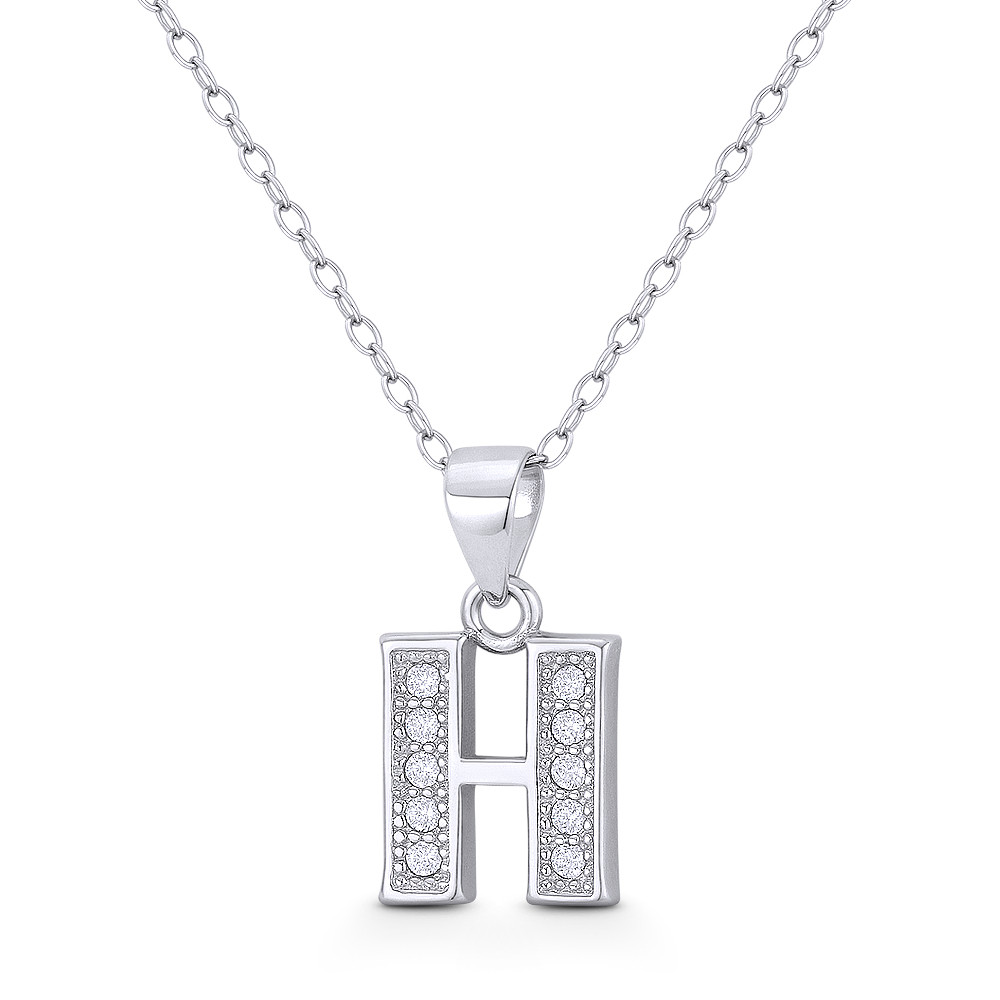 Loading... Please wait...The featured pendant is cast in .925 sterling silver and showcases a block script initial "H" design paved w/ cubic zirconia crystals. The pendant is then finished with a sturdy bail that will accommodate most standard chains and plated with rhodium.