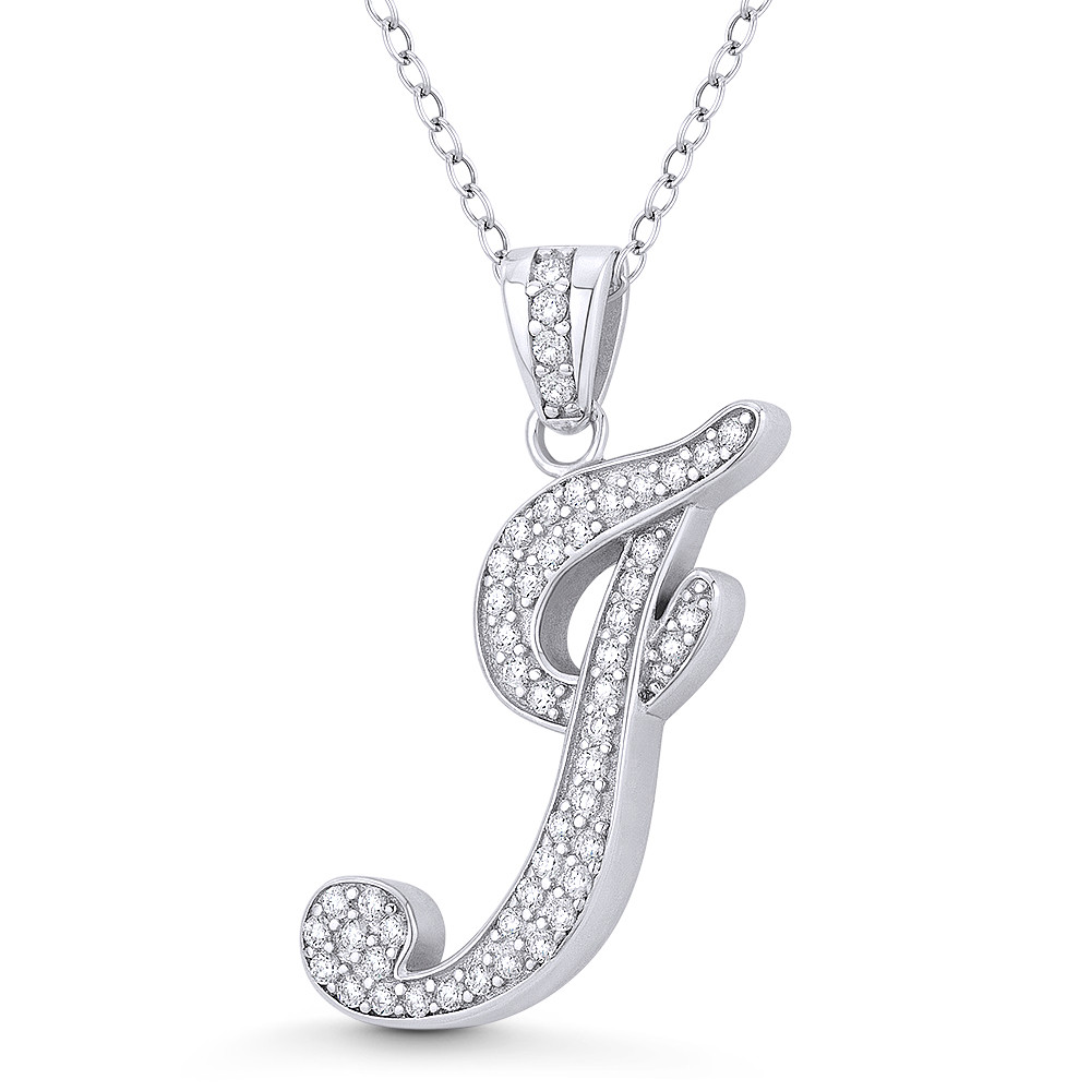 Loading... Please wait...The featured pendant is cast in .925 sterling silver and showcases a cursive script initial "J" design paved w/ cubic zirconia crystals. The pendant is then finished with a sturdy bail that will accommodate most standard chains and plated with rhodium.