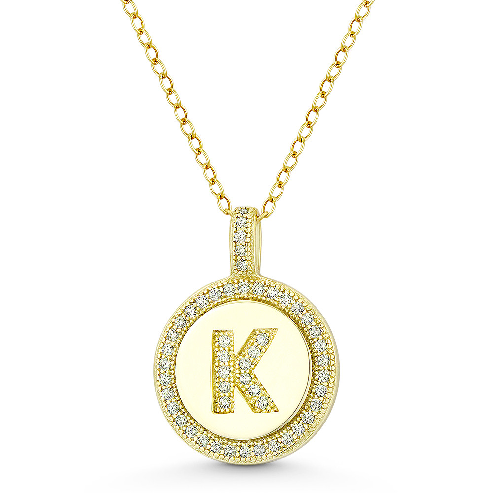 Loading... Please wait...The featured pendant is cast in .925 sterling silver w/ 14k yellow gold plating and showcases a round disc adorned with cubic zirconia crystals paved along the bail, around the disc, and the letter "K" centerpiece design.