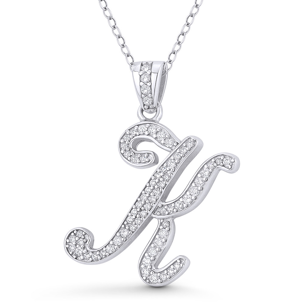 Loading... Please wait...The featured pendant is cast in .925 sterling silver and showcases a cursive script initial "K" design paved w/ cubic zirconia crystals. The pendant is then finished with a sturdy bail that will accommodate most standard chains and plated with rhodium.