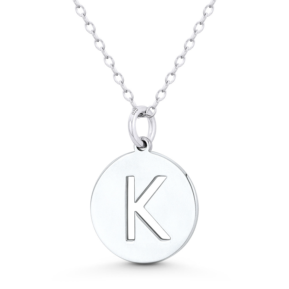 Loading... Please wait...The featured pendant is cast in .925 sterling silver and showcases a 15mm (0.6in) round flat disc detailed with an initial "K" cutout. The disc is then finished with a small ring bail that can accommodate thin chains so it can be worn as a pendant or as an additional charm for your bracelets, necklaces, or other accessories.