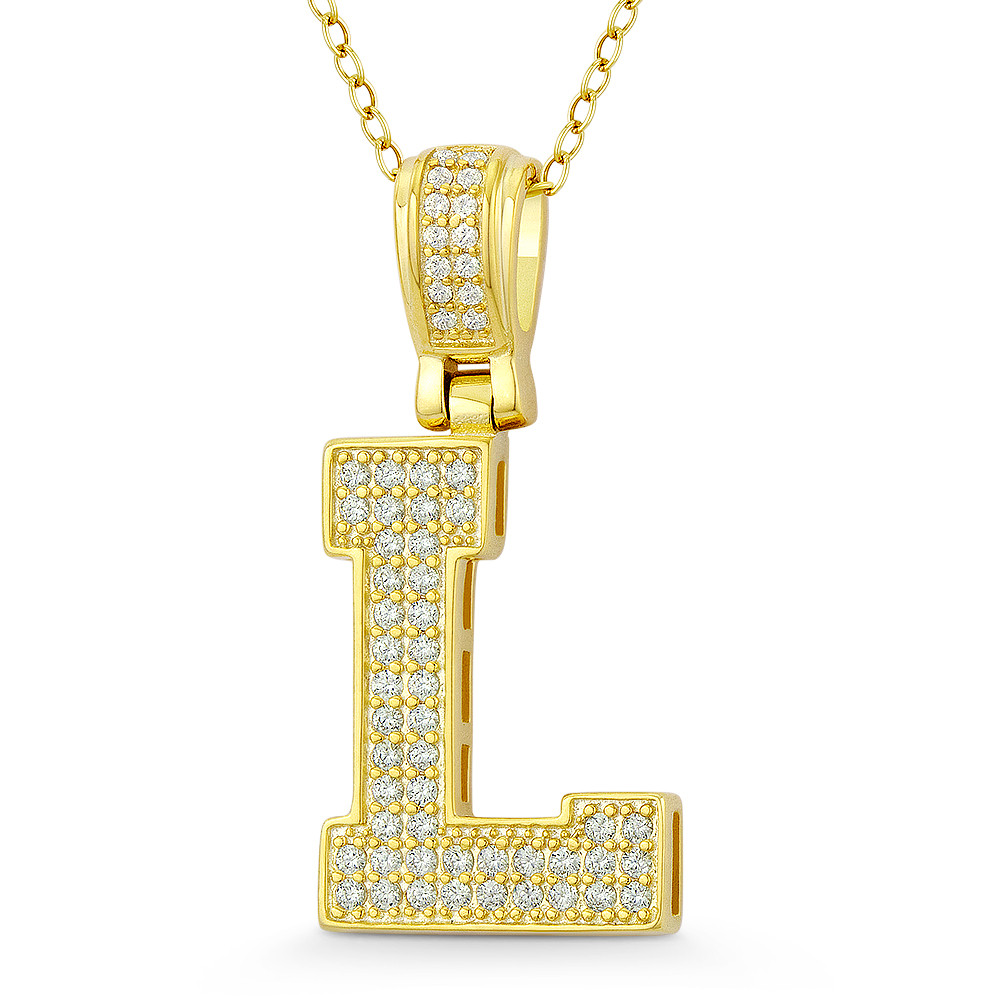 Loading... Please wait...The featured pendant is cast in .925 sterling silver and showcases a block script initial "L" design paved w/ cubic zirconia crystals. The pendant is then finished with a sturdy bail that will accommodate most standard chains and plated with 14k yellow gold.
