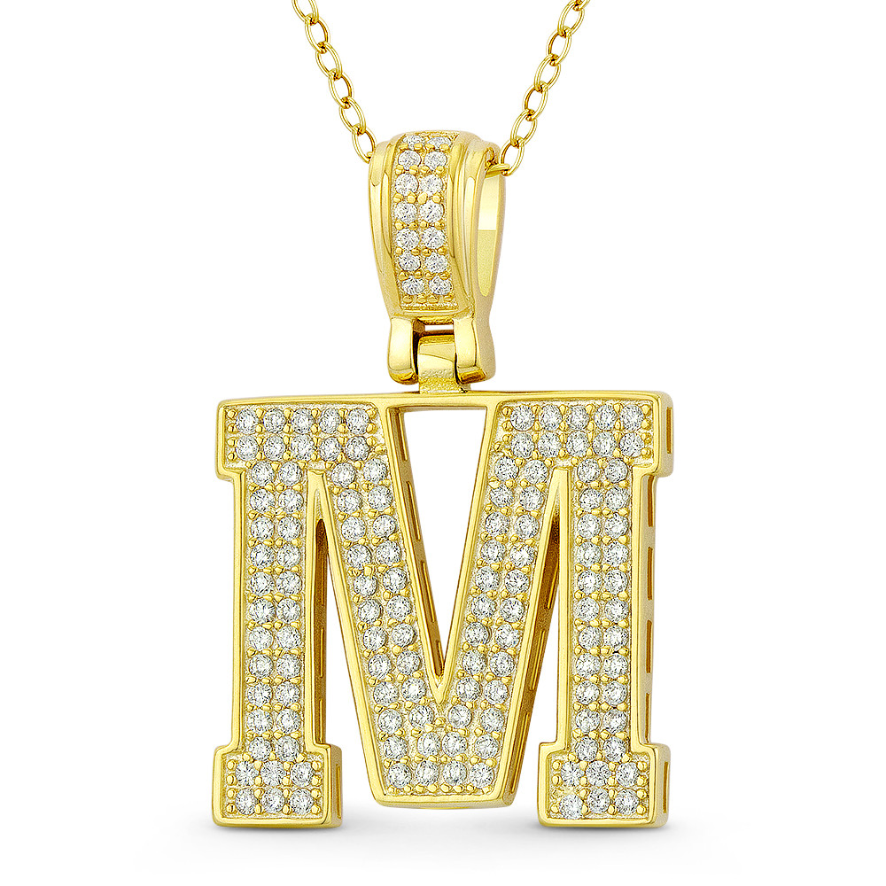Loading... Please wait...The featured pendant is cast in .925 sterling silver and showcases a block script initial "M" design paved w/ cubic zirconia crystals. The pendant is then finished with a sturdy bail that will accommodate most standard chains and plated with 14k yellow gold.