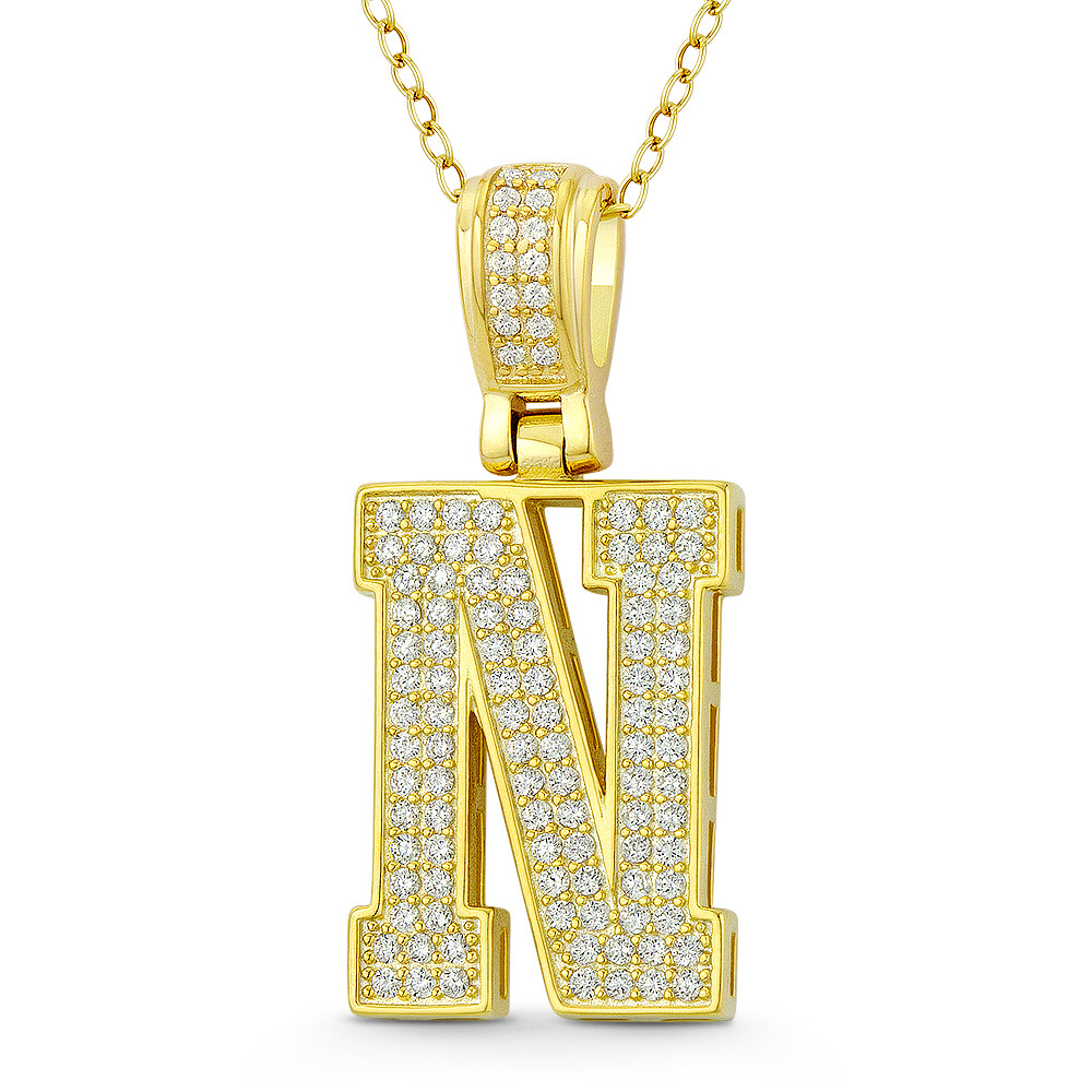 Loading... Please wait...The featured pendant is cast in .925 sterling silver and showcases a block script initial "N" design paved w/ cubic zirconia crystals. The pendant is then finished with a sturdy bail that will accommodate most standard chains and plated with 14k yellow gold.