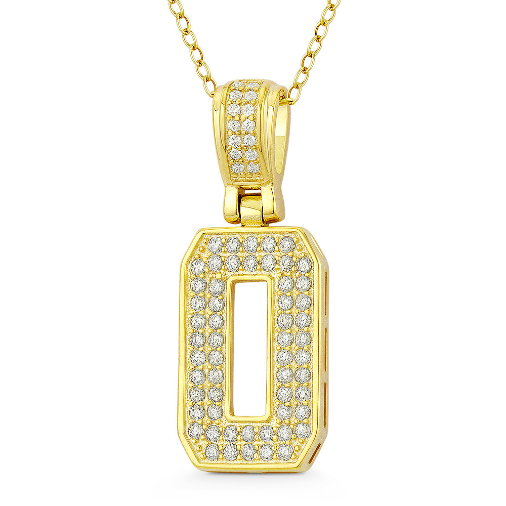 Loading... Please wait...The featured pendant is cast in .925 sterling silver and showcases a block script initial "O" design paved w/ cubic zirconia crystals. The pendant is then finished with a sturdy bail that will accommodate most standard chains and plated with 14k yellow gold.