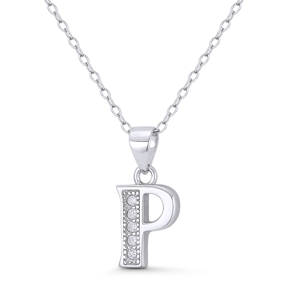 Loading... Please wait...The featured pendant is cast in .925 sterling silver and showcases a block script initial "P" design paved w/ cubic zirconia crystals. The pendant is then finished with a sturdy bail that will accommodate most standard chains and plated with rhodium.