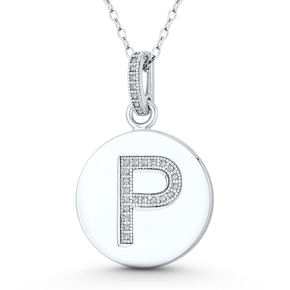 Loading... Please wait...The featured charm is cast in .925 sterling silver and showcases an 18mm (0.7in) round disc adorned with cubic zirconia crystals to form a brilliant initial P at the center. The disc is then plated with rhodium and finished w/ a sturdy cz-encrusted bail that will accommodate most standard chain sizes.