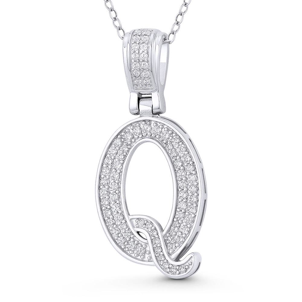 Loading... Please wait...The featured pendant is cast in .925 sterling silver and showcases a block script initial "Q" design paved w/ cubic zirconia crystals. The pendant is then finished with a sturdy bail that will accommodate most standard chains and plated with rhodium.