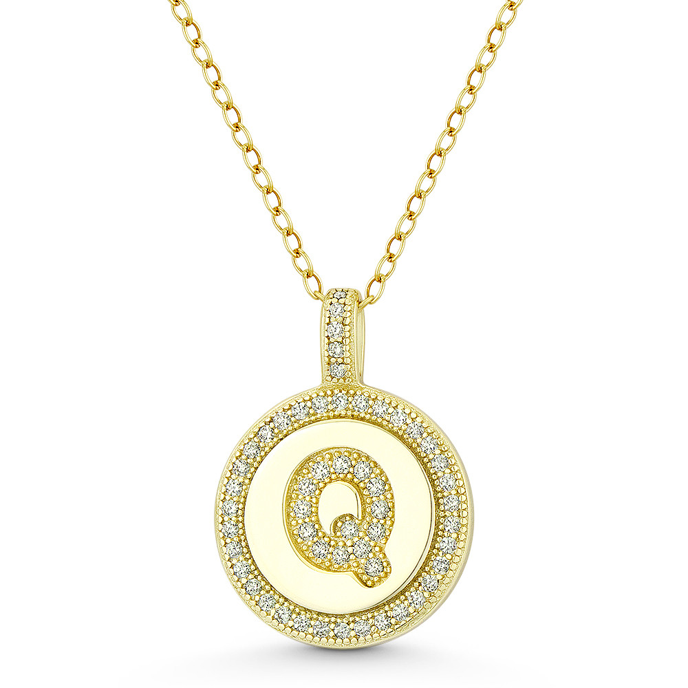 Loading... Please wait...The featured pendant is cast in .925 sterling silver w/ 14k yellow gold plating and showcases a round disc adorned with cubic zirconia crystals paved along the bail, around the disc, and the letter "Q" centerpiece design.
