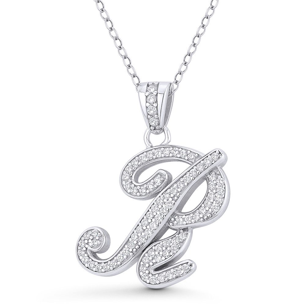 Loading... Please wait...The featured pendant is cast in .925 sterling silver and showcases a cursive script initial "R" design paved w/ cubic zirconia crystals. The pendant is then finished with a sturdy bail that will accommodate most standard chains and plated with rhodium.
