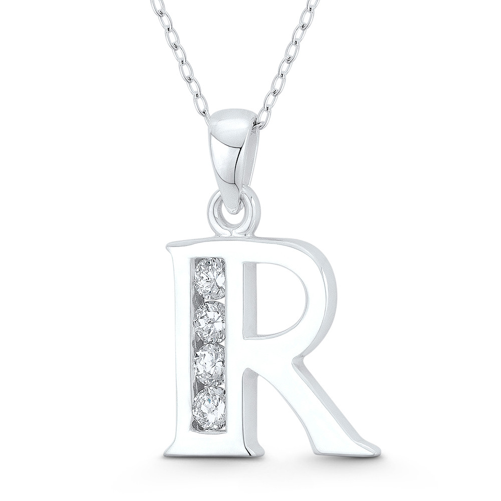 Loading... Please wait...The featured pendant is cast in .925 sterling silver and showcases an initial "R" design adorned with round brilliant cut cubic zirconia crystals. The pendant is then finished with a sturdy bail that can accommodate most chain sizes.