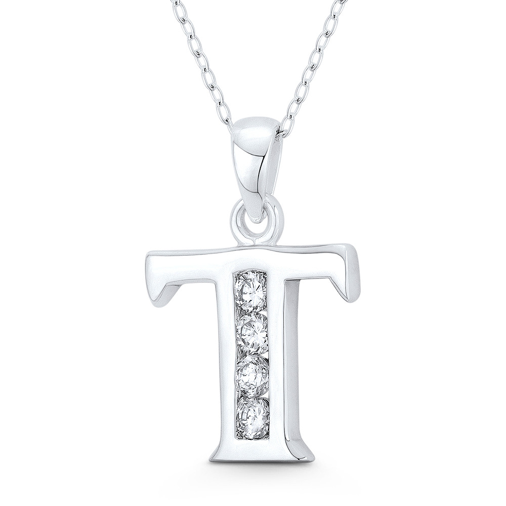 Loading... Please wait...The featured pendant is cast in .925 sterling silver and showcases an initial "T" design adorned with round brilliant cut cubic zirconia crystals. The pendant is then finished with a sturdy bail that can accommodate most chain sizes.