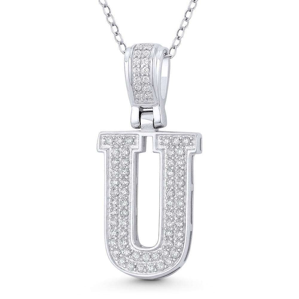 Loading... Please wait...The featured pendant is cast in .925 sterling silver and showcases a block script initial "U" design paved w/ cubic zirconia crystals. The pendant is then finished with a sturdy bail that will accommodate most standard chains and plated with rhodium.