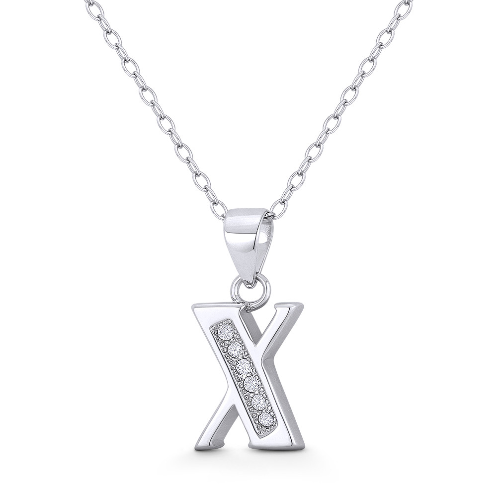Loading... Please wait...The featured pendant is cast in .925 sterling silver and showcases a block script initial "X" design paved w/ cubic zirconia crystals. The pendant is then finished with a sturdy bail that will accommodate most standard chains and plated with rhodium.