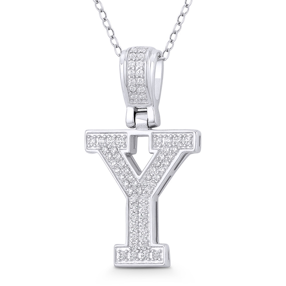 Loading... Please wait...The featured pendant is cast in .925 sterling silver and showcases a block script initial "Y" design paved w/ cubic zirconia crystals. The pendant is then finished with a sturdy bail that will accommodate most standard chains and plated with rhodium.