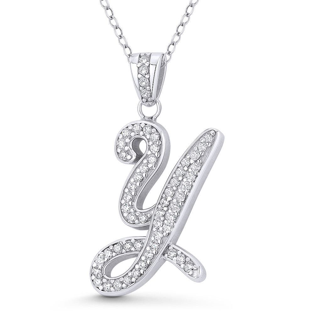Loading... Please wait...The featured pendant is cast in .925 sterling silver and showcases a cursive script initial "Y" design paved w/ cubic zirconia crystals. The pendant is then finished with a sturdy bail that will accommodate most standard chains and plated with rhodium.