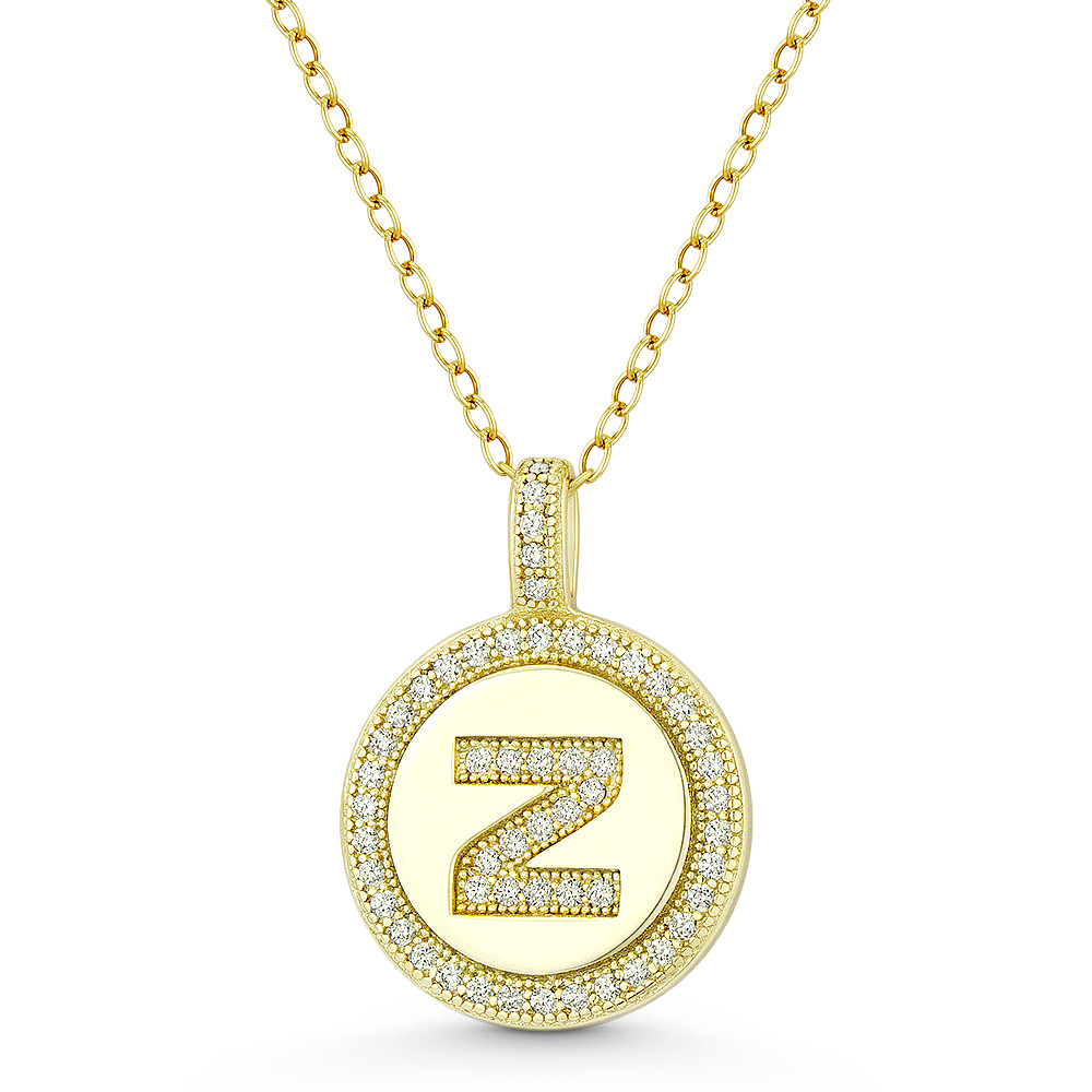 Loading... Please wait...The featured pendant is cast in .925 sterling silver w/ 14k yellow gold plating and showcases a round disc adorned with cubic zirconia crystals paved along the bail, around the disc, and the letter "Z" centerpiece design.