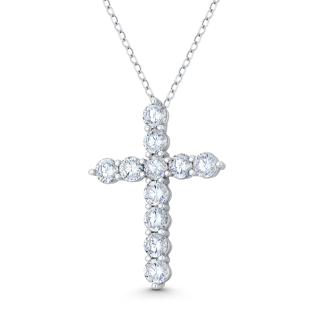 Loading... Please wait...The featured pendant is cast in rhodium-plated .925 sterling silver and showcases a classic latin cross adorned with 11 round brilliant cut cubic zirconia crystals finished with a top loop that will accommodate most chain sizes.