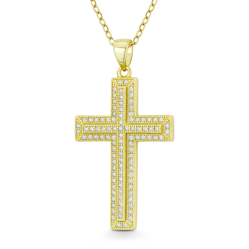 Loading... Please wait...The featured pendant is cast in 14k yellow gold-plated .925 sterling silver and showcases a classic latin cross paved with cubic zirconia crystals then finished with a large & sturdy bail that will accommodate most chain sizes.